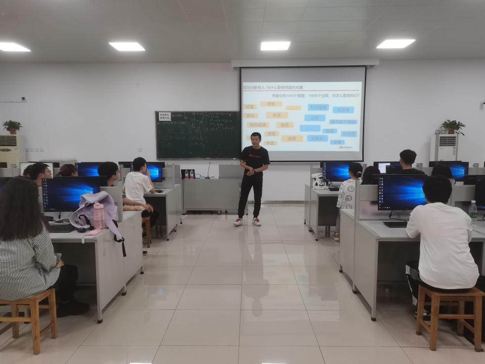 课程前半段,宋志朋老师主要进行理论讲授。从程序设计语言的发展历程引出为什么要使用面向对象,面向对象的特性以及基本语法等,讲述过程中积极与员工互动。后半段,宋志朋老师引导员工开始编程实操,鼓励员工们不懂就问。员工们也非常珍惜这样的学习机会,不仅积极提问,还主动上台演示自己的程序,即使在休息时间也舍不得离开机房,仍然继续练习实战。