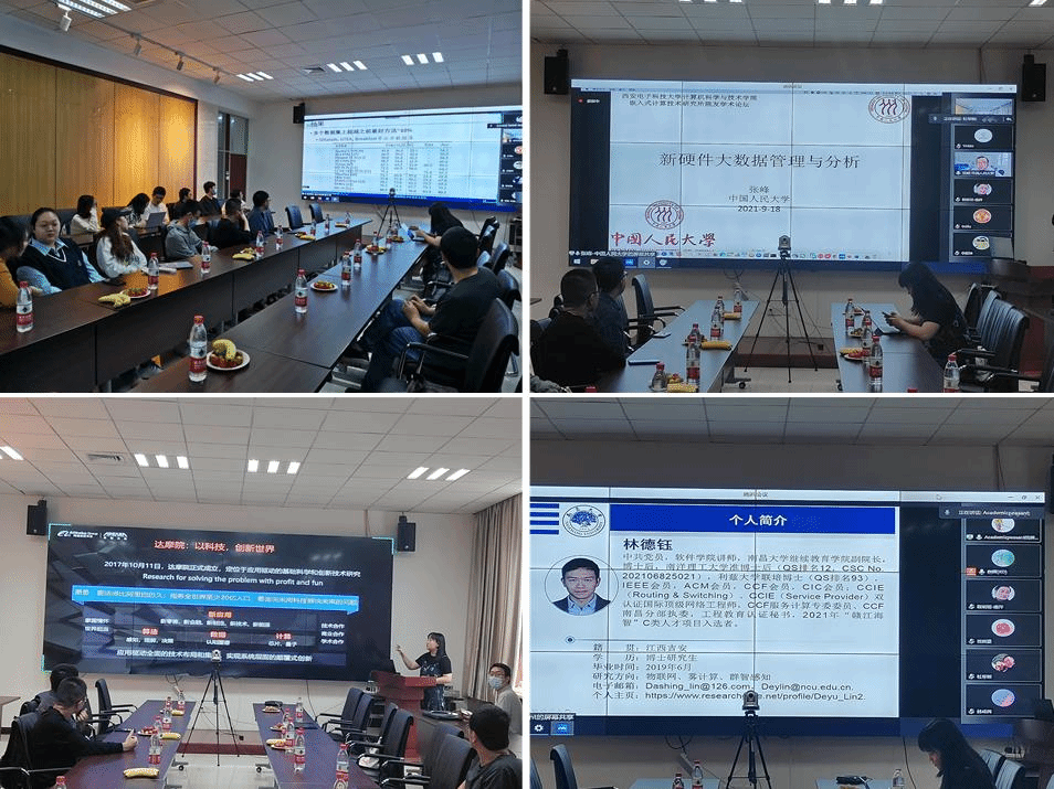 南开大学程明明教授、中国人民大学张峰副教授、阿里巴巴达摩院视觉技术高级算法专家唐铭谦、南昌大学继续教育公司副经理林德钰博士、公司永利yl23411讲师黄钊博士先后带来了精彩的报告。程明明教授就大规模图像的多粒度目标检测进行了详细的报告,阐述了从实例、图像、以及整个数据集三个粒度出发,对大规模图像集合进行联合分析,以减少图像理解算法对大规模精确标注依赖的过程。张峰副教授以新硬件大数据管理与分析为主题,并结合大数据管理技术正经历以软件为中心到以数据为中心的计算平台变迁的时代背景,重点关注新型硬件环境给大数据管理与分析领域带来的机遇与挑战,介绍了混合异构硬件环境下大数据应用加速的最新研究进展。阿里达摩院视觉技术高级算法专家唐铭谦介绍了视频内容结构化、多模态搜索、视频场景下内容合成,结合媒体AI及AI编辑部产品,赋能融媒体应用的最新进展。随后,林德钰博士简单综述了万物感知及互联、数能一体化通信的相关进展,深度剖析了两者有机结合存在的重要挑战,理性分析并指出了其科学合理的解决方案。黄钊博士以新时代下"硬件安全"前沿研究技术分享为主题,从可靠和安全两个维度出发,针对物联网等典型应用,探讨了可靠芯片的安防检维技术,深入分析了"硬件安全"问题产生的背景以及目前主要的防护手段和策略。参加论坛的师生与报告嘉宾就相关技术难点和个人职业规划问题进行了深入交流。