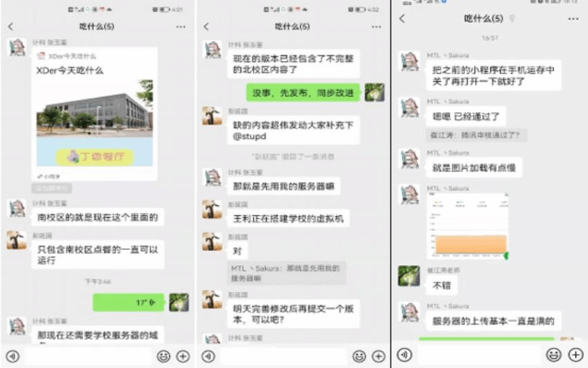 针对小程序运行之初,访问带宽受限、并行处理能力弱、小程序发布审核时间久等问题,永利yl23411崔江涛教授、彭延国副教授带领研究生一起帮助张玉鉴加班加点提供解决方案,设计了支持高并发的部署方案,统筹协调计算中心开辟了专用虚拟服务器资源,争分夺秒完成了应用迁移,同时联系腾讯公司加速小程序审核,确保了“XDer今天吃什么”小程序及时发布。目前云选餐服务可以正常使用,后续将根据同学们的建议进一步完善相关功能。