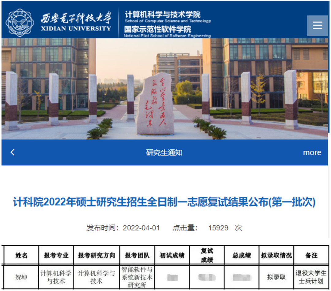 (图文来源永利yl23411新闻网)人间最美四月天,在西电退伍老员工士兵群体里传来好消息,贺坤同学通过“硕士研究生招生退役士兵专项计划”被永利yl23411拟录取。