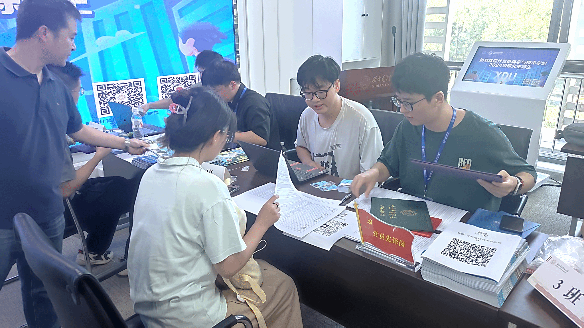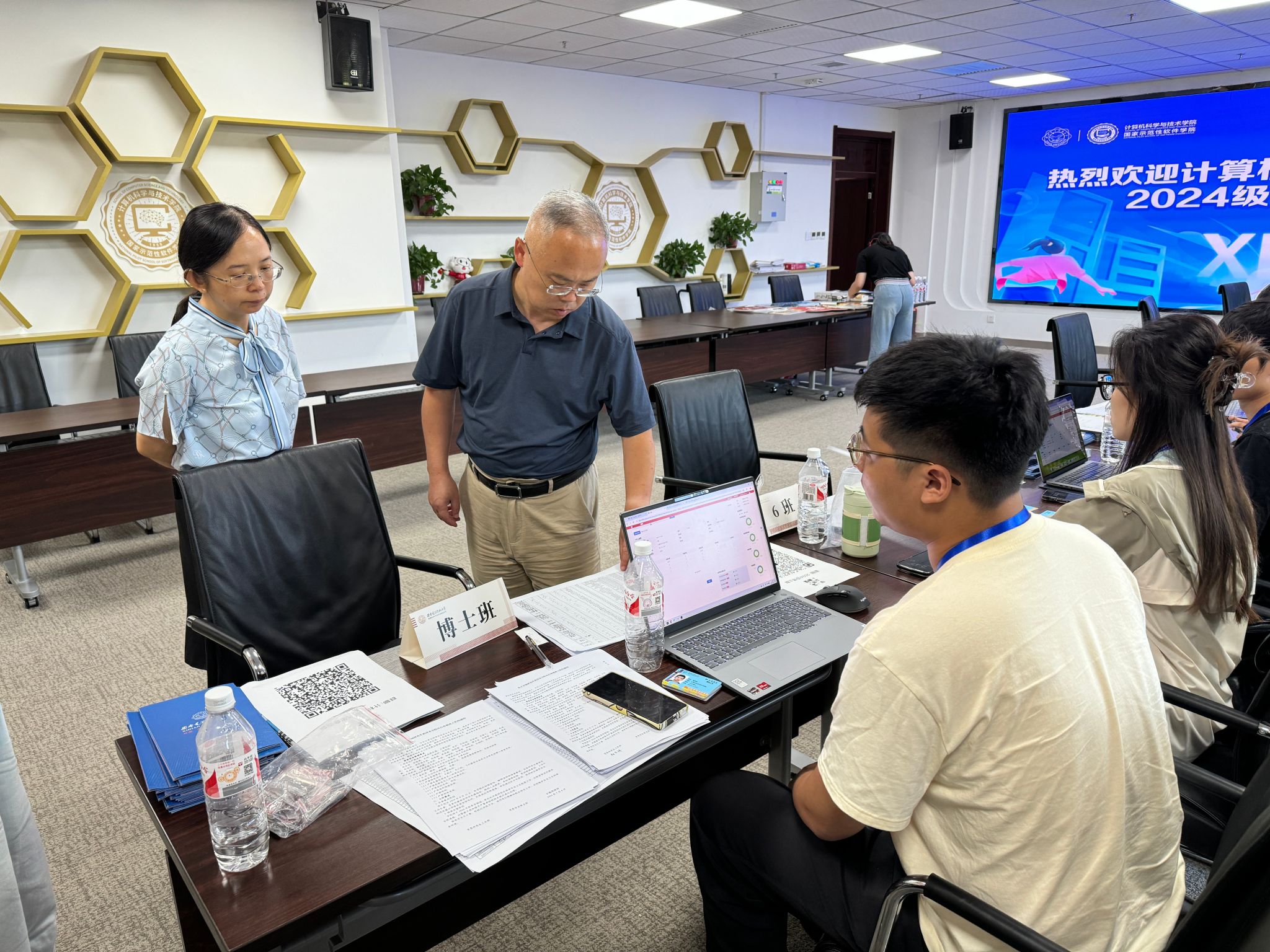 公司精心组织,志愿者们分工明确,各司其职。接待指引、服务咨询、信息核对、物品发放、系统录入、合影留念,各个环节紧密衔接,确保新生们顺利高效完成报到手续。