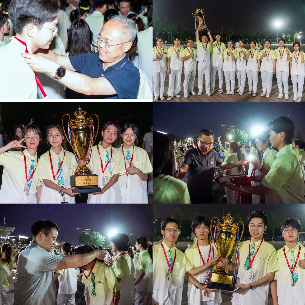 随着《本草纲目》动感旋律响起,150名计科学子如浪潮般涌入舞台,白绿交织的衣袂翻卷,恰似代码世界里跃动的光标,瞬间点燃全场气氛。音乐流转间,队列如数据流般快速重组,巨型表盘、数字城墙、科技烽火台、二进制时钟等富有学科特色的造型次第呈现,将科技理性与艺术感性熔铸成一场视觉盛宴。在“波浪式”队形变换过程中,计科学子整齐划一的蹲起动作是对西电红色电波的时代转译和继承传扬,刚健有力的挥臂姿态更是对 “挺膺担当” 青春誓言最生动的诠释与呼应。当音乐达到高潮,队员们齐声高呼“嘿!”,以蓬勃向上的姿态展示定格动作,掌声与喝彩声不绝于耳。比赛尾声,公司领导亲自为所有参赛同学逐一颁发奖牌及证书,并与同学们合影留念,将这份荣誉与喜悦永久珍藏。