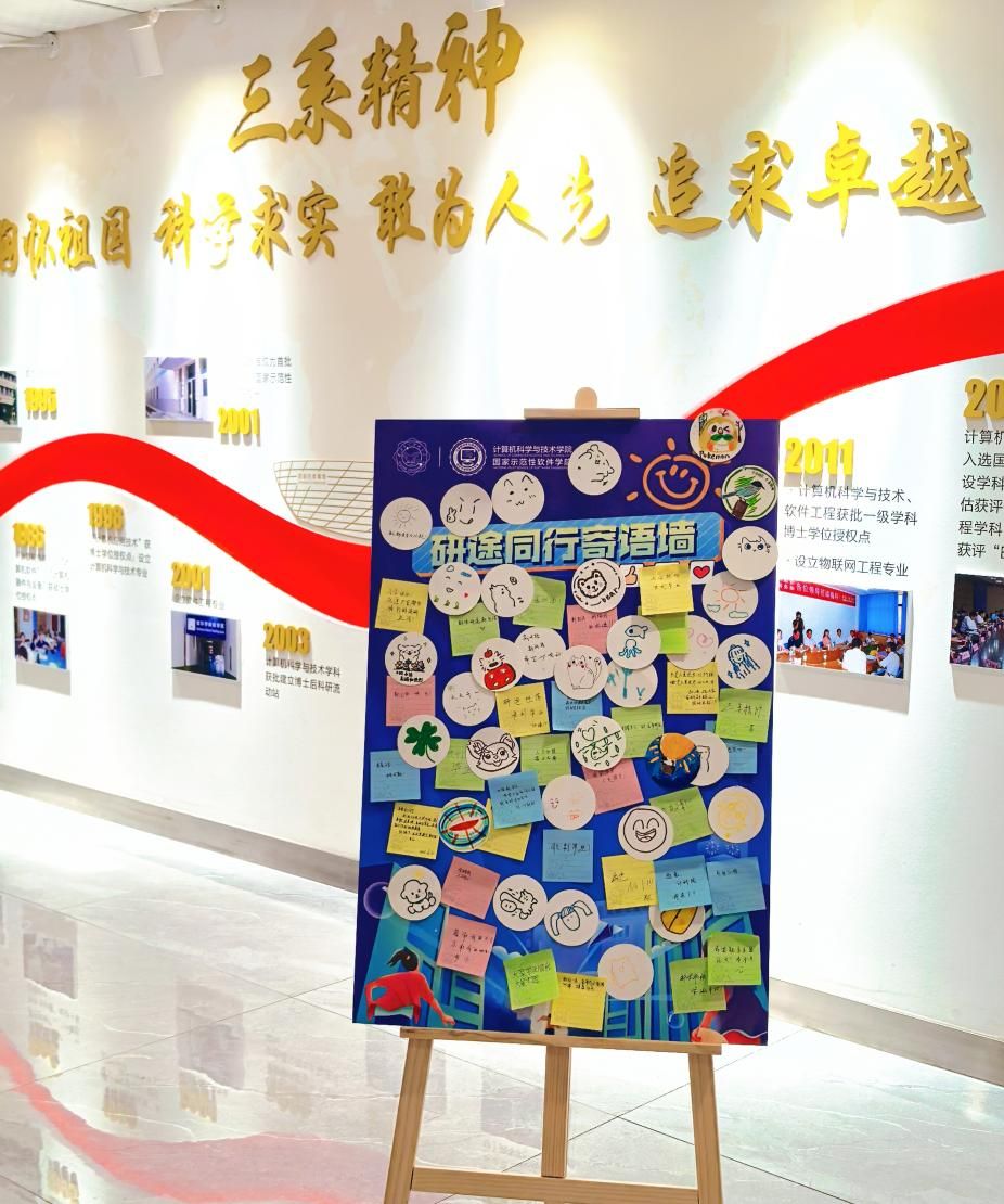 为搭建公司毕业生与新生间的精神桥梁,公司在迎新现场精心设置“研途同行寄语墙”,以手写寄语为载体,让跨越时光的鼓励与期许,成为新生开启研途的第一份精神礼物。新生们可以抽取来自2025届毕业学长学姐们所手写的暖心寄语,一句“祝你们一路繁花,永远相信研途星光,永远爱人与被爱”,让大家在字里行间感受到浓厚的鼓励与期许。不少新生也尽情书写下自己的心愿与感悟,驻足阅读彼此的留言,感受着计科大家庭的温暖与传承。