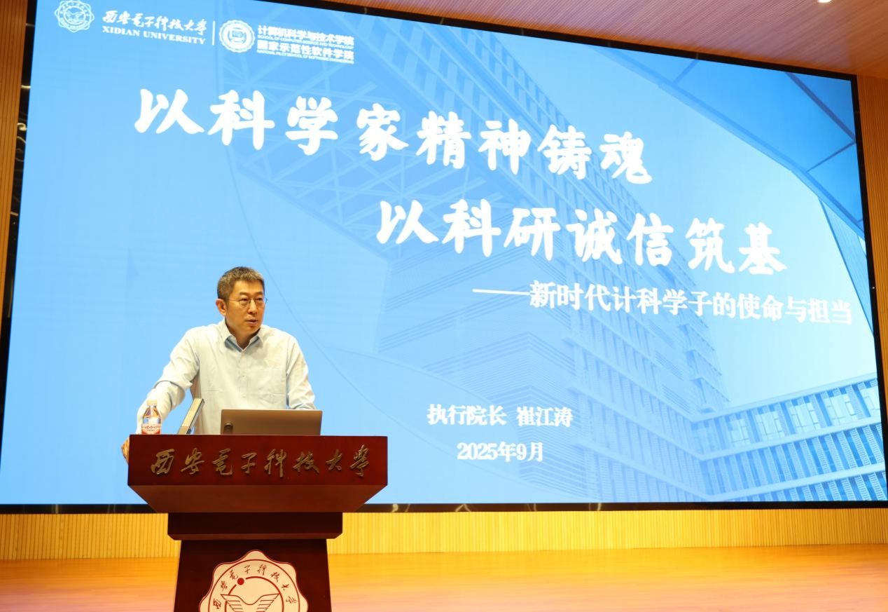 (通讯员 何敏之)为引导研究生新生树立正确学术价值观,筑牢科学道德防线,9月12日下午,永利yl23411在南校区网安大楼B-101报告厅开展“以科学家精神铸魂,以科研诚信筑基——新时代计科学子的使命与担当”主题讲座,公司执行经理崔江涛教授主讲,全体2025级研究生新生参加,会议由副经理杨力主持。