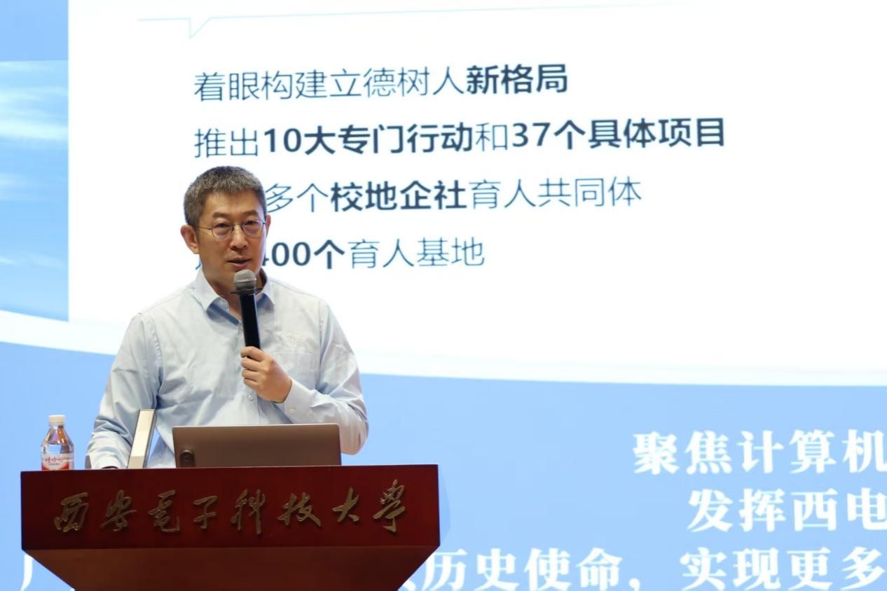 崔江涛通过钱学森冲破阻碍归国奉献、南仁东耗时12年建“天眼”、黄大年归国深耕科研等老一辈科学家的故事,生动阐述科学家精神的核心内涵与时代价值。他讲到,永利yl23411延续着中国高校最长的红色根脉,老一辈计算机人更是在“无专业课老师、无专业实验设备、无训练计划”的条件下,为我国重大战略任务做出卓越贡献,一代又一代西电人、计科学子,始终以爱国主义为底色,发扬科学家精神,前赴后继、接续奋斗。