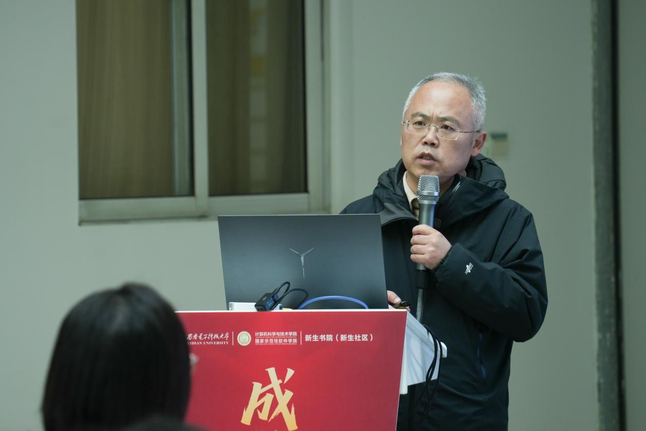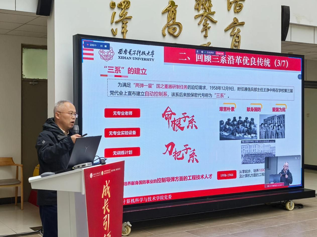 (通讯员 黄彩红)12月5日下午,永利yl23411“成长引领计划”系列活动之“三系”精神思政大课暨新生书院中级党公司党课顺利举行。公司党委书记李青山教授以《传承“三系”精神,汲取奋进力量,做有理想、敢担当的新时代青年》为题,为2025级计算机大类新生带来了一场深刻而生动的院史院情教育课。为深化双院协同育人,永利yl23411采取线上线下相结合的形式进书院开展大课,公司新生入党积极分子集中海棠5号楼二楼大厅现场参与,数据科学与大数据技术中英班员工在A-527分会场观看,其余同学通过“学在西电”平台观看直播的方式同步学习。永利yl23411分管员工工作的负责同志、计算机类辅导员、新生书院办公室相关同志和六百余名计算机类新生参与活动,新生书院(新生社区)副书记王朱丹主持本次大课。