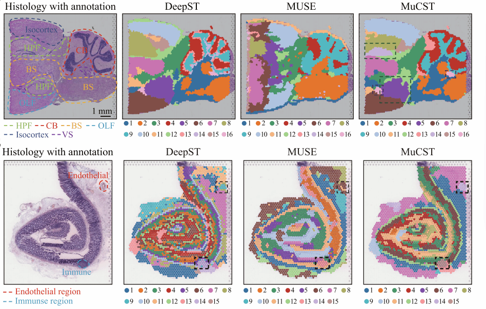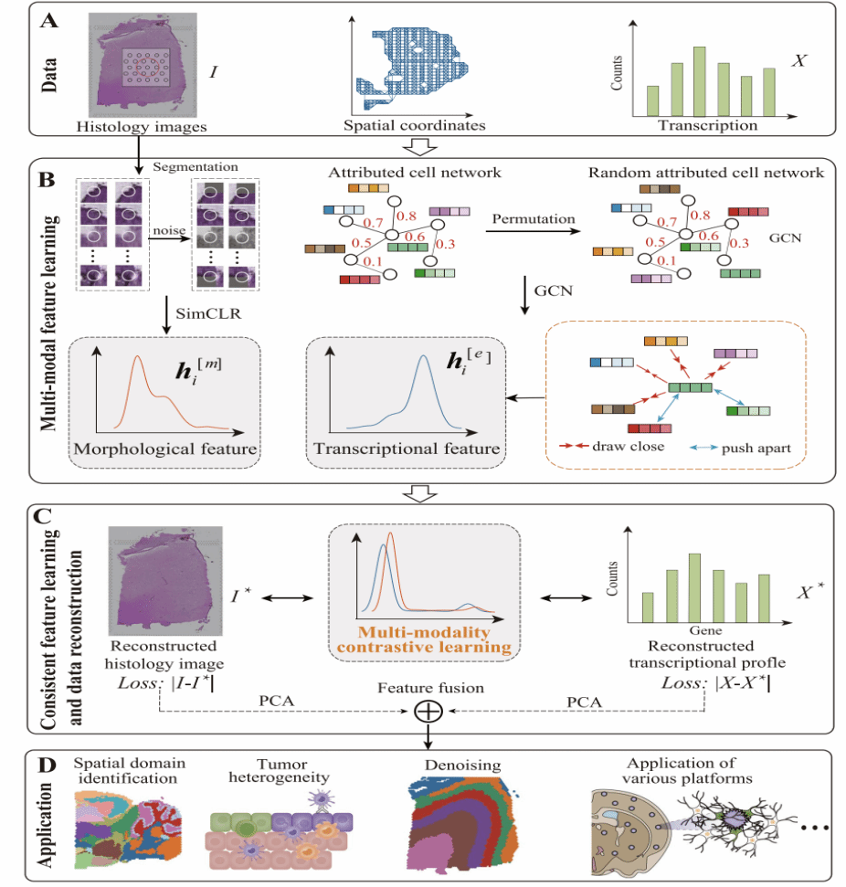 在临床医学数据智能分析方面,针对肿瘤组织宏观影像与微观基因组数据融合难的问题,通过和广东省人民医院放射科主任刘再毅教授进行深度合作,面向空间转录组与医学影像数据,提出了一种多模态对比学习的图学习模型。利用深度学习获取医学影像特征,利用图神经网络获取细胞的转录特征与空间特征,采用多模态对比学习对不同模态特征进行对比,通过拉近不同模态特征的分布来降低多模态特征的异质性,从而全面地表征癌症肿瘤组织。研究结果表明所提出的智能融合算法能够对现有的空间转录测序平台数据实现全覆盖,可更精确地识别肿瘤的病变区域,发现并可视化致癌基因分子标志物。为解析临床空间肿瘤组织切片和探索癌症发病机制提供有效的分析工具与计算手段,辅助癌症精确诊疗。