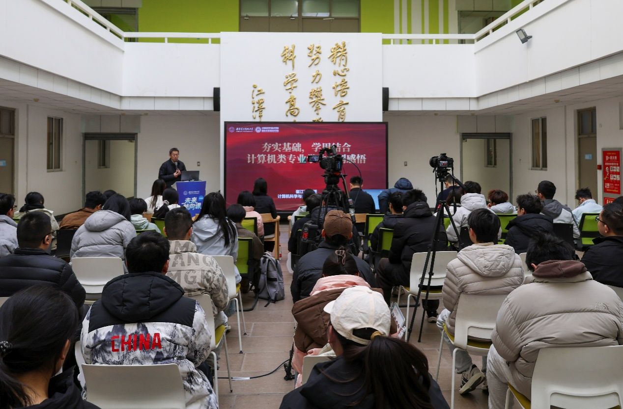 12月25日下午,永利yl23411执行经理崔江涛以《夯实基础,学用结合——计算机类学业规划感悟》为题,结合自身求学经历与成长故事,为2025级新生讲授未来航向课,勉励新生筑牢专业基础、树立科研报国志向。报告在海棠5号楼书院文化大厅举行,并通过“学在西电”平台同步直播,永利yl23411分管员工工作的负责同志、计算机类辅导员、新生书院办公室相关同志和六百余名计算机类新生参与活动。