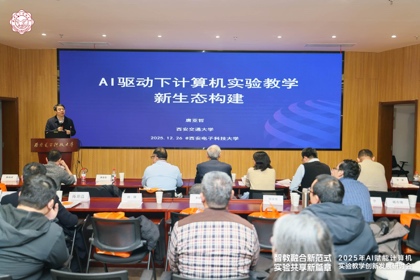 特邀报告环节。陕西师范大学二级教授、国家级教学名师傅钢善以《人工智能赋能高等教育创新发展》为主题,从技术演进中的教育变革与人工智能赋能高等教育创新两个层面展开阐述。他指出,高等教育实验教学应主动驾驭人工智能技术,以适应技术变革催生的新场景、新应用、新关系与新范式,从而推动实验教学体系的系统性解构、重构与创新。清华大学李山山教授以《从计算机实验教学体系建设到资源构建—这些年我们做了哪些事》为题,分享了清华大学在计算机实验教学体系与资源建设方面的历程,以及如何通过学情数据进行员工胜任力分析和AI时代下对实践教学改革的思考和探索。西安交通大学唐亚哲教授以《AI驱动下计算机实验教学新生态构建》为切入点,系统介绍了西安交大在AI赋能试点班建设中实施的“四步式”路径,并以计算机组成专题实验为例,具体说明了AI赋能实验教学的落地方案与成效。