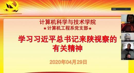 (通讯员 杨鹏飞)4月20日至23日,习近平总书记来到陕西考察。他深入自然保护区、贫困山区、社区、公司、企业等,了解秦岭生态环境保护、脱贫攻坚、复工复产等情况,就统筹推进新冠肺炎疫情防控和经济社会发展工作、打赢脱贫攻坚战进行调研,看望慰问干部群众。为深入学习领会习近平总书记视察期间的重要讲话精神,永利yl23411计算机工程系党支部于4月29日晚召开支部专题学习会,会议由支部书记鱼亮主持。