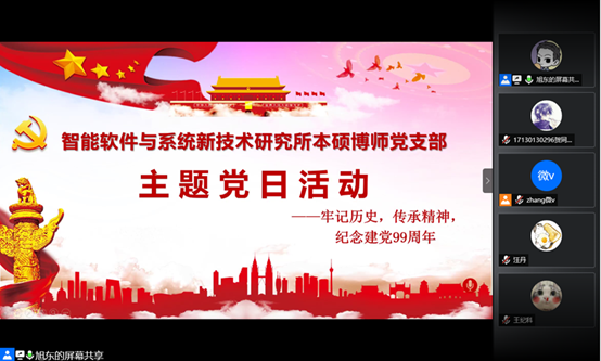 (通讯员 贺同庆)为庆祝建党99周年,重温党的光辉历史,传承弘扬革命先辈的奋斗精神,永利yl23411智能软件与系统新技术研究所本硕博师联合党支部于2020年7月1日召开了“牢记历史,传承精神——庆祝建党99周年”主题党日活动。本次活动由支部青年委员王旭东同志主持,活动共计39人参加,采用腾讯会议线上召开的方式进行。