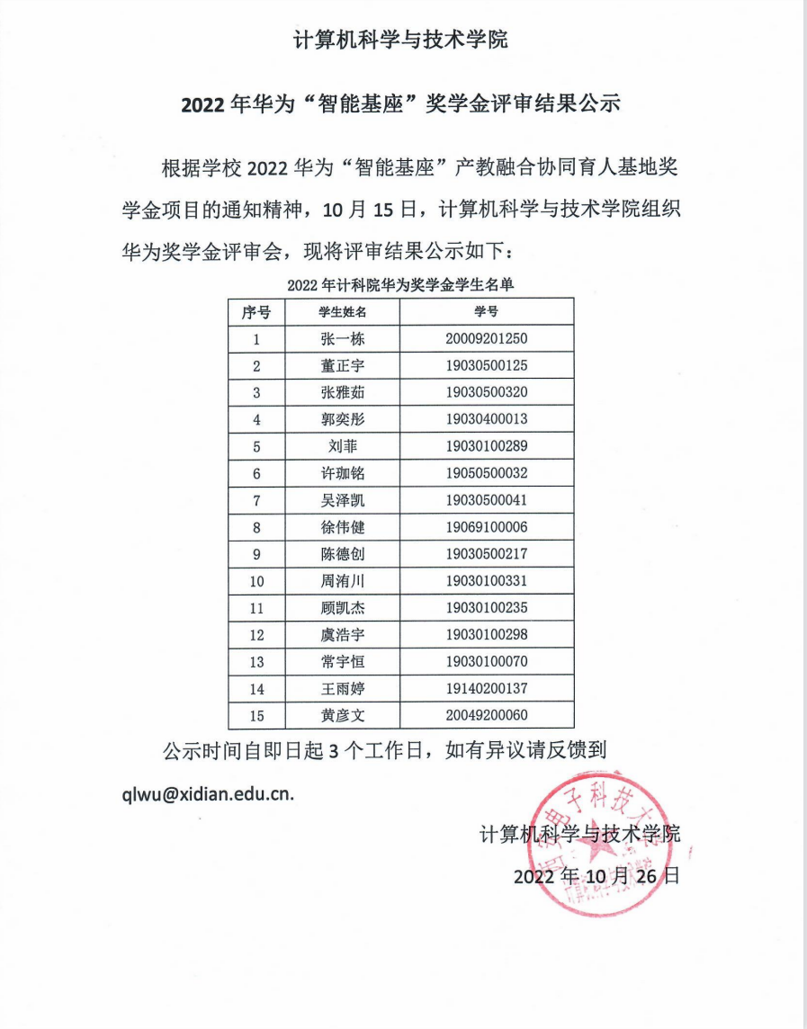 2022年华为“智能基座”奖学金评审结果公示