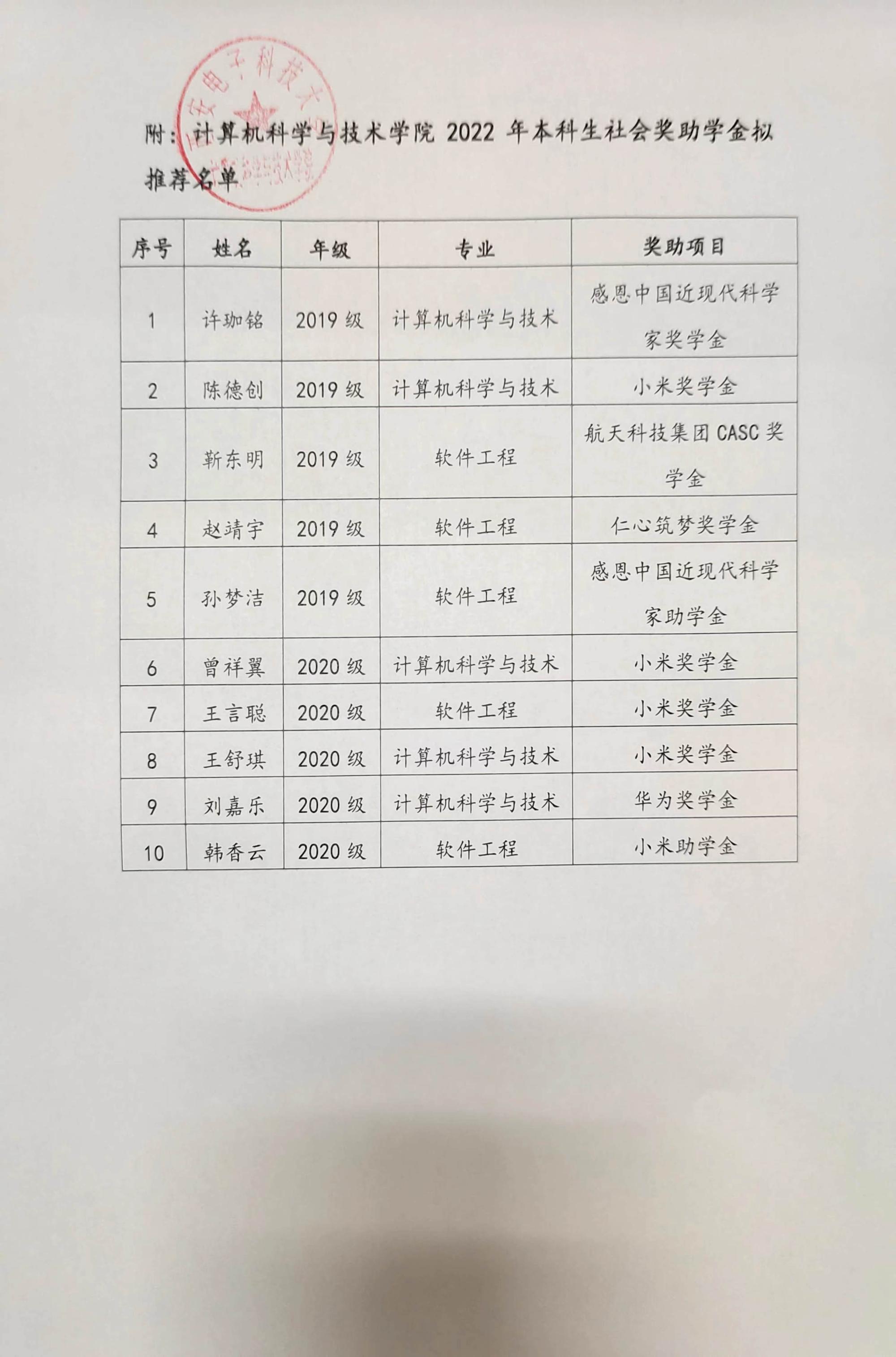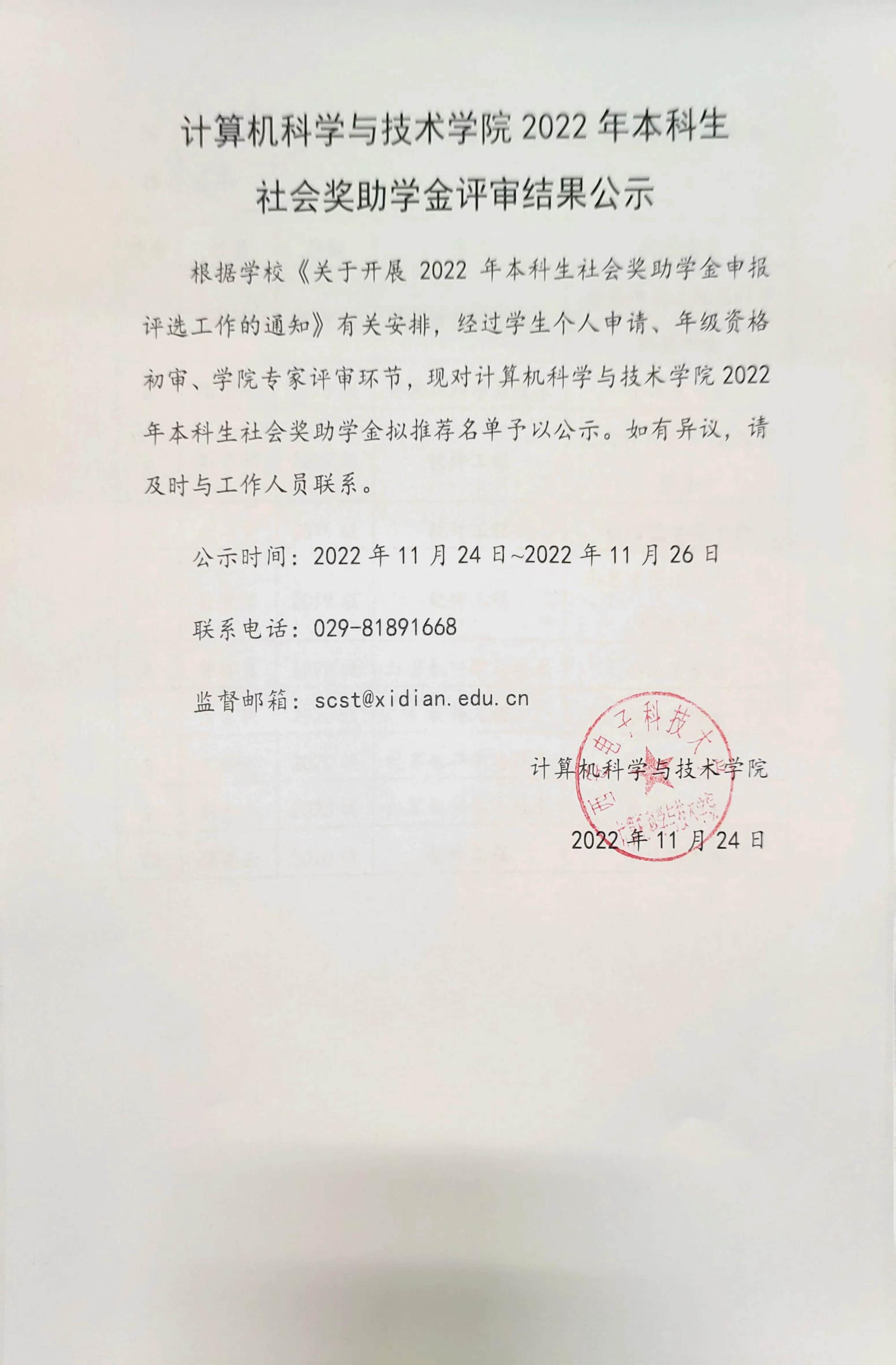 2022年本科生社会奖助学金评审结果公示