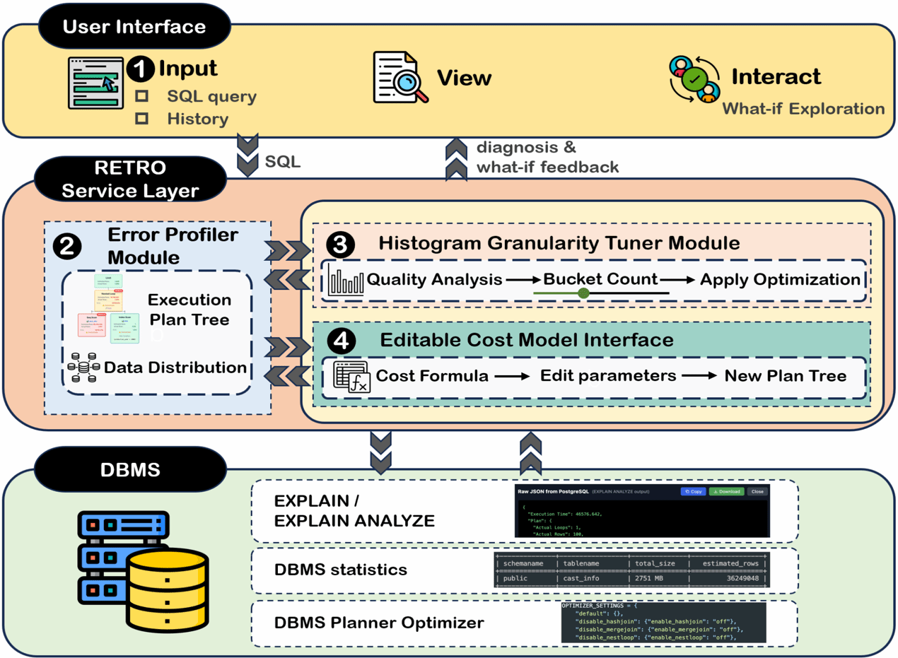 关系查询优化是数据库课程中的核心内容,而基数估计误差常常会扭曲代价估计、影响连接顺序与算子选择,却缺乏直观有效的教学支撑。论文RETRO: A Visual Tool for Understanding Cardinality Estimation Errors For Database Education提出交互式教学工具 RETRO,用于帮助学习者理解并诊断基数估计误差。RETRO 提出了基数估计误差根因算子发现算法,自动发现并高亮根因算子及估计偏差,并结合直方图、最常见值分布和 distinct value 等统计信息,辅助分析误差来源。在此基础上,系统进一步支持统计粒度调节与智能调优,从而帮助学习者观察统计信息和代价假设变化对估计结果、计划选择及运行性能的影响。论文第一作者为硕士研究生张雅妮和翟槟蓥,通讯作者为李辉教授。