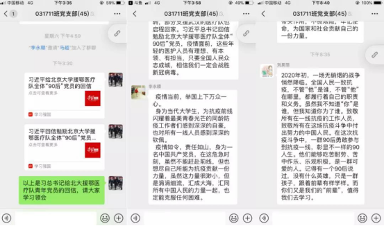 3月15日,习近平总书记给北京大学援鄂医疗队全体“90后”党员回信,向他们和奋斗在疫情防控各条战线上的广大青年,致以诚挚的问候。回信在广大青年员工,特别是党员中引起热烈反响。3月18日下午,永利yl23411硕士031711班第一、二党支部举办了线上主题党日活动,围绕“学习习近平总书记回信精神,绽放青春绚丽之花”主题,认真学习回信精神,展开热烈讨论。
