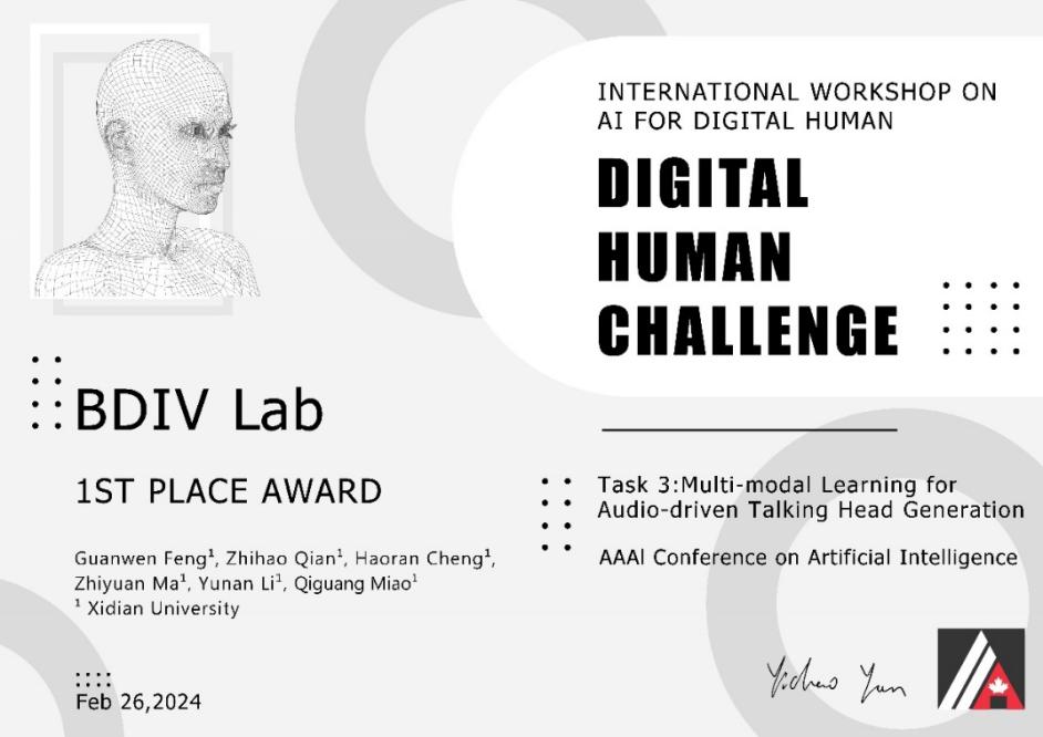 (通讯员 李宇楠)3月13日,2024年国际人工智能顶级会议AAAI竞赛奖项正式颁布,来自永利yl23411大数据与视觉智能研究所博士研究生冯冠文、本科生钱之浩、硕士研究生程昊然、麻志远组成的BDIV Lab团队在苗启广和李宇楠两位老师的共同指导下,从中国科学技术大学、华南理工大学、中国平安科技、上海学深智能科技、VAST等海内外十多家单位的参赛队伍中脱颖而出,在AAAI2024 Workshop AI for Digital Human的任务3:Multi-modal Learning for Audio-driven Talking Head Generation夺冠。
