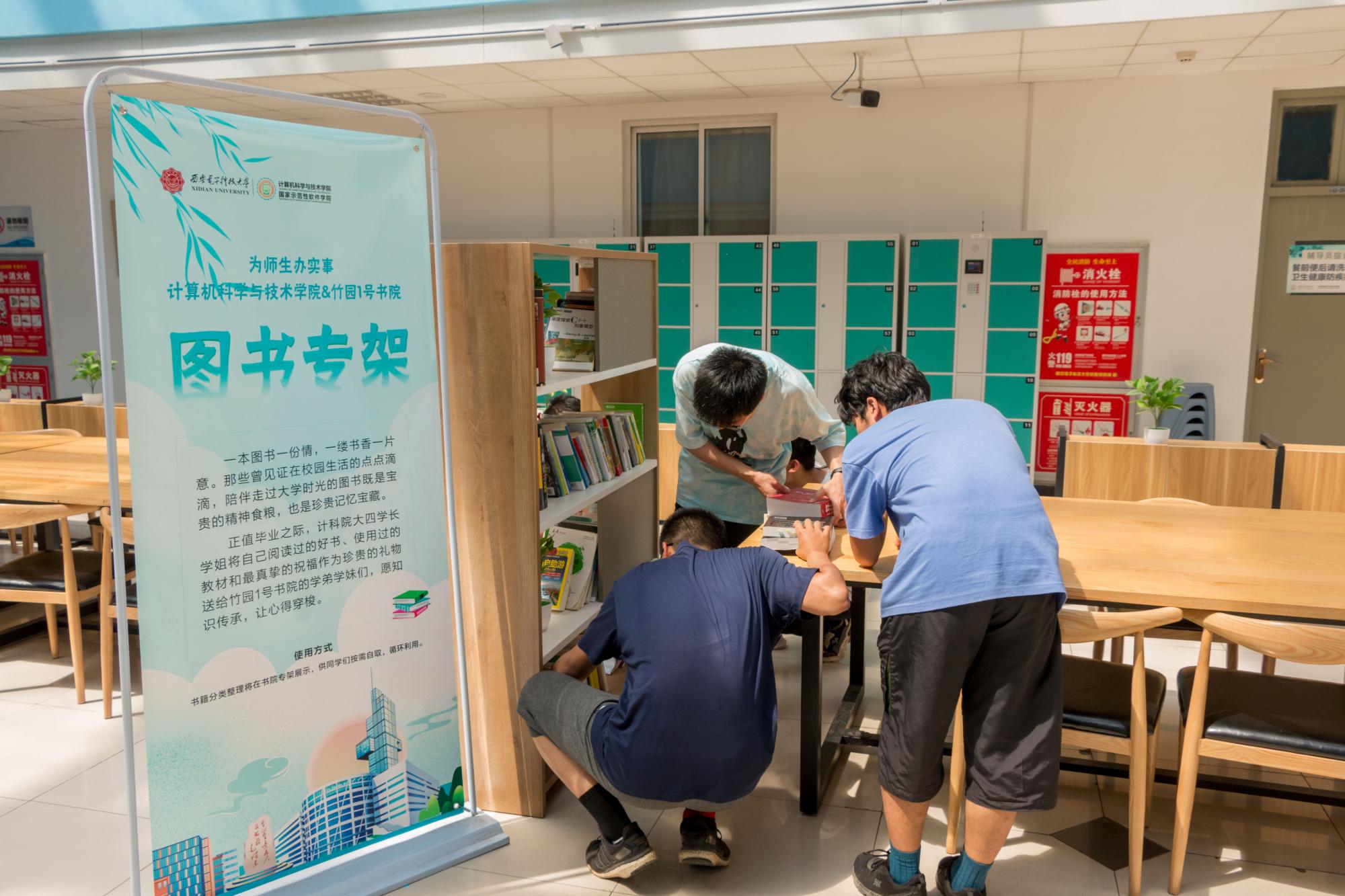永利yl23411联动竹园1号书院将所赠书籍分类整理在书院大厅打造“图书专架”展示,供同学们按需自取,循环利用。活动结束后,大一同学们纷纷驻步围看图书展架,挑选自己所需要的书籍,将学长学姐的积累与祝福传承。