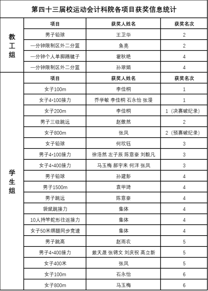 为期两天的赛程中,计科师生奋勇拼搏、突破自我,多个项目均有亮眼表现。其中,2020级计算机科学与技术专业本科生李佳桐和张凤分别打破员工组女子200米和女子800米校运会记录。教工组也不甘落后,王卫华荣获教工组男子中年乙组铅球比赛第2名,霍秋艳在一分钟个人单脚踢毽子项目中取得第4名,在教工女子组一分钟限制区外投二分篮项目中鱼亮和孙翠娟也分别取得第2名和第4名的好成绩。最终,永利yl23411员工组以103分获得团体总分第四名。