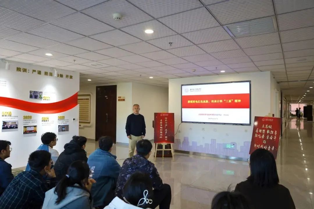 为充分发挥红色院史资源的育人导向功能,赋能时代新人培育,引导广大学子从“三系”精神中汲取力量,11月17日下午,应学工处“小马扎”流动课堂邀请,计算机科学与技术公司党委书记李青山教授在南校区网安大楼“三系”精神文化育人空间为党史校史宣讲团代表、第78期老员工高级党校学员代表带来“赓续红色西电血脉,传承计科‘三系’精神”主题分享报告。党委学工部副部长李超、党委学工部员工党建科王朱丹参加了本次活动。