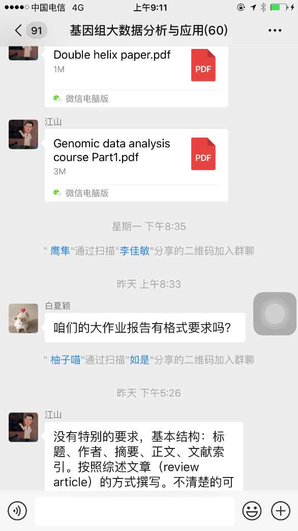 江山博士首先对同学们的相关知识背景,通过提问的方式做了一些调查,在了解同学们的基础上,对本课程的学习意义和学习目的进行了系统的介绍。江山博士以基因组大数据的独特性质、当前主流分析方法与应用、以及存在的挑战性问题贯穿课程的教学任务,并在课堂中通过讨论方式活跃上课气氛。在课后,江山博士通过微信群与同学进行交流,发送学习资料,布置相应任务等。江山博士丰富的学识以及详细生动的讲述使同学们纷纷表示受益匪浅。