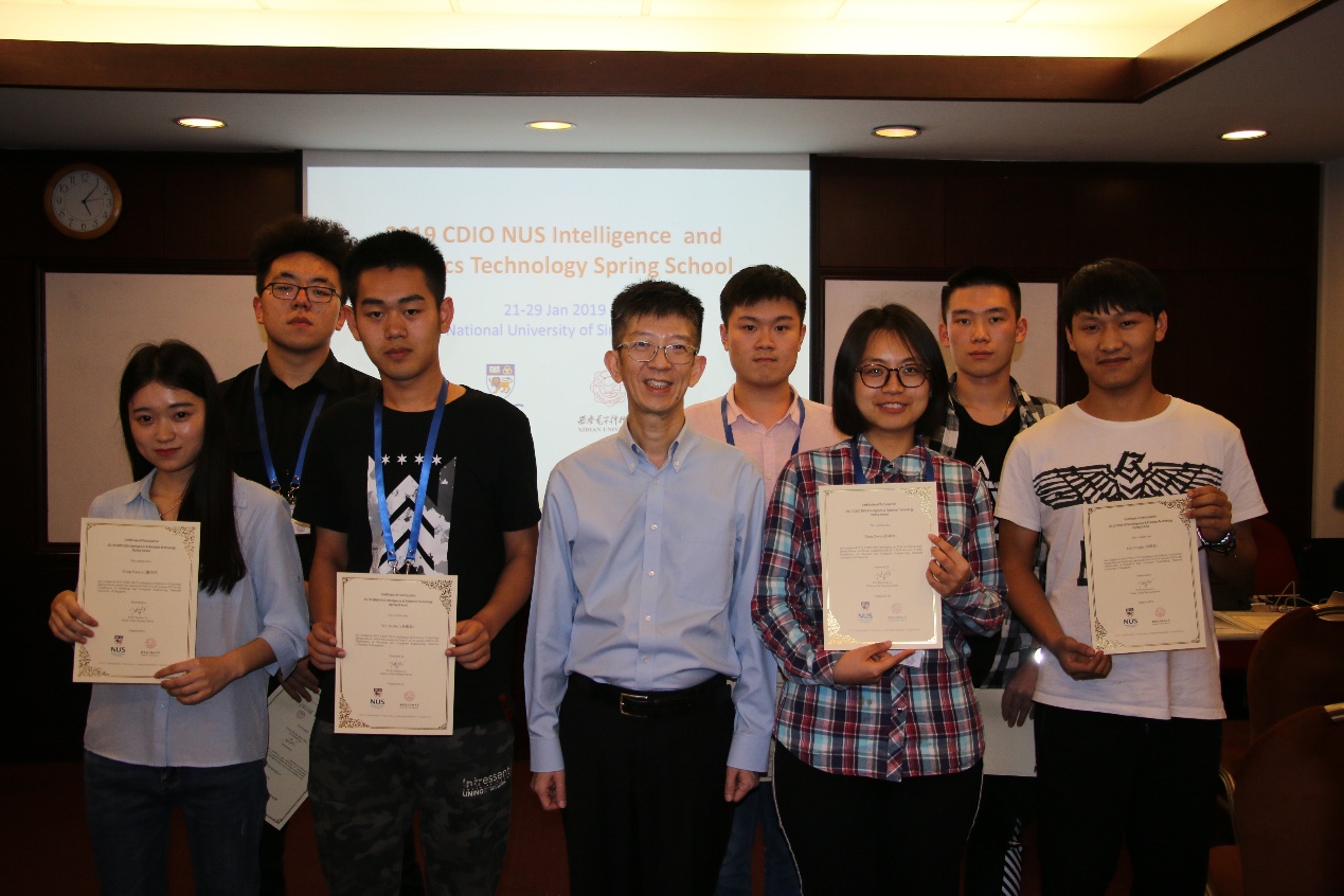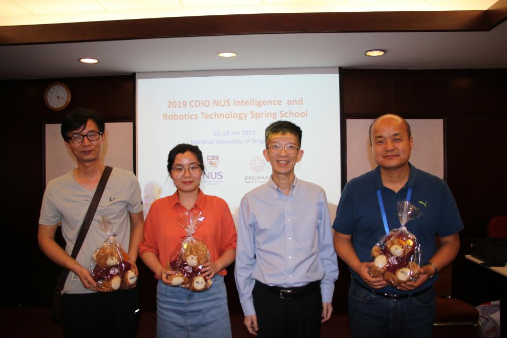 为期7天的新CDIO世读-新加坡国立大学(NUS)智能机器人技术训练营(第四期)转瞬即逝,同学们在1月28日下午进行了分组报告,把自己的人工智能领域的所感所悟和在新加坡的体会进行了总结分享,由张蓉丽博士、权义宁老师和钟华倩等老师对大家的报告进行了验收,并评出了优秀奖。李海洲教授亲自为优秀奖获得者颁发了证书,并为每个同学颁发了结业证书。