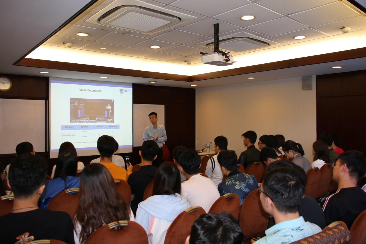 1月22日下午,不顾旅途劳累,同学们来到了新加坡科技研究局(Agency for Science, Technology and Research, A*STAR),由新加坡科技研究局资讯通信研究院高级科学家Dong Minghui博士先向同学们介绍了A*STAR的各个部门,包括BMRC、JCO、SERC和ETPL以及SERC等的研究方向,随后董博士给同学们做了“Speech Processing  Platform:AcousticModel,Lecxical,Machine Translation,               Dialogue Technology, Meeting Recognition and Summarization”的报告,深入浅出地介绍了智能语音交互技术、机器翻译技术、自动对话技术和自动会议语音识别与摘要技术及其发展现状与实际应用。董博士团队的孙研究员以Employee Analytics为例,演示了团队大数据分析的成果,使同学们对机器学习和深度学习有了初步的概念,对智能语音处理技术产生了极大的兴趣。