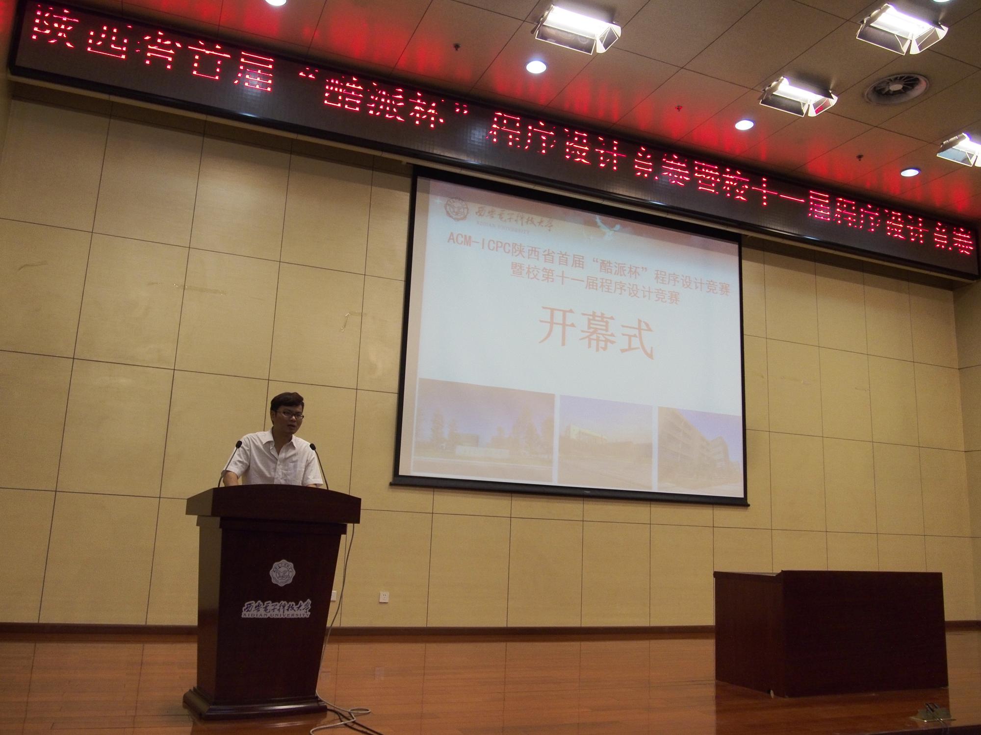 上午9点30分,开幕式在南校区行政楼206举行。130余名参赛选手和教练身着比赛服装参加了开幕式。永利yl23411实验室与设备处处长黄大林、计算机公司党委书记于晓飞、副经理王泉、西安交通大学软件公司副经理陈建明以及赞助商宇龙计算机通信科技有限公司西安研究所所长周佳庆先生等嘉宾出席。ACM/ICPC中国西部指导委员会委员周鹏教授专程从美国赶来出席开幕式。