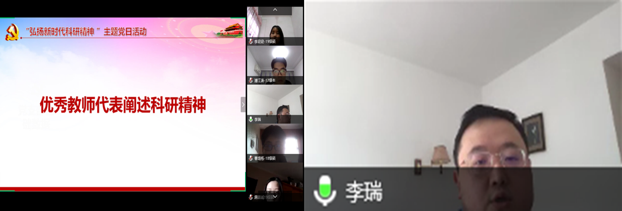 随后,本科生党员谈论了自己对科研工作的期待和向往,也展示了自己对科研工作的认识。本科生党员王纪科提出,作为一个本科生,在听取了李瑞老师的发言后,明白做科研不是盲目追求热门,而应该结合自己的能力和兴趣,选择合适的科研方向,并且在接下来的日子里也要尽快提高自己的专业素养,才能为今后打好科研基础;本科生党员屈家鼎也谈到,大学的课程和生活,使他对科研这方面了解越来越多,并且觉得科研是一项非常伟大而又艰巨的事业,科研需要的不仅仅是想法,更需要的是知识的积累、能力的提升以及对科研的热爱。