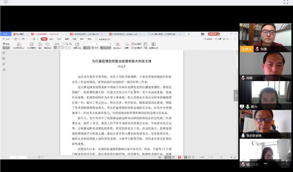 首先,杨力传达了公司党委理论中心组(扩大)学习会的会议精神,领学了习近平总书记发表的重要文章《为打赢疫情防控阻击战提供强大科技支撑》,此次新冠肺炎疫情来势凶猛,在党中央坚强领导下,经过各方面艰苦努力,目前疫情防控形势积极向好的态势正在拓展,但疫情仍尚未完全结束。支部号召各位党员认真学习领会文件精神,积极响应党中央号召,发挥专业优势,支持科研攻关,为疫情防控贡献自己的一份力量。