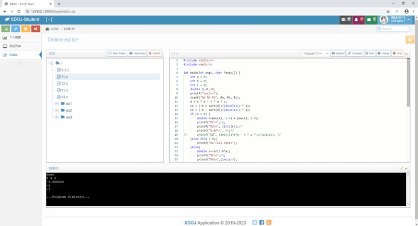 目前主要工作是优化原有功能、新增在线代码编辑器模块,包含在线编辑、编译、运行等功能。由于部分员工电脑没有安装编译软件,此举可以满足员工直接在XDOJ平台上进行编程练习的需求。针对不同机房环境对员工考试有不同的影响,新增的模块将统一编辑环境和编辑工具,未来会在2020级新生中使用。同时引入基于深度神经网络的代码分类功能,更智能地判断员工考试程序的相似度,作为后期成绩复核的依据。