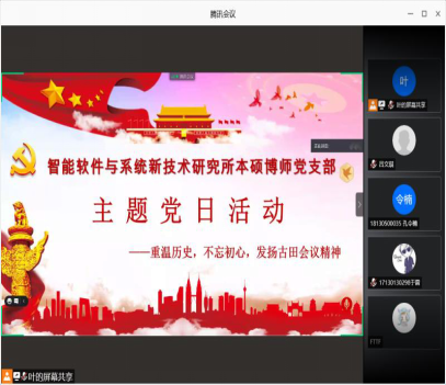 (通讯员 张恒运)为庆祝中国共产党建党100周年,深入学习贯彻习近平总书记在党史学习教育动员大会上的重要指示精神,从党的非凡历程和实践中汲取初心使命的力量,永利yl23411智能软件与系统新技术研究所本硕博师联合党支部于2021年5月28日下午开展了“重温党史,不忘初心,发扬古田会议精神”主题党日活动。活动由支部副书记吕文琪同志主持,共计56人参加,会议以线上和线下的方式进行展开。
