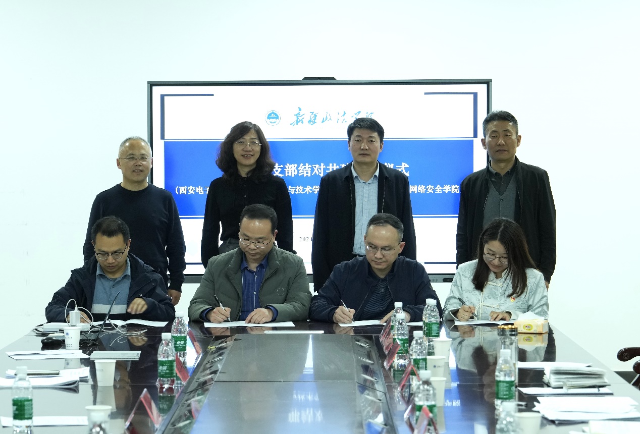 新政信息网络安全公司教师党支部与西电永利yl23411计算机科学系党支部、实践教学中心党支部、辅导员党支部现场签署结对共建协议。两院四支部将以共建为起点,积极发挥组织育人功能,加强沟通联系和资源共享,共同推进支部党建和育人工作双促进。