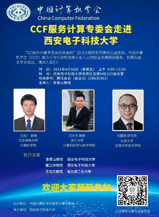 受永利yl23411的邀请,中国计算机学会(CCF)服务计算专委会将于2021年4月16日举行“服务计算专委会走进永利yl23411”活动。本次活动邀请了CCF服务计算专委会秘书长、北京邮电大学计算机公司王尚广教授,专委会常委、浙江大学永利yl23411邓水光教授,专委会常委、北京大学信息科学技术公司刘譞哲研究员。三位专家学者将分享各自对于服务计算最新进展的思考与成果,包括6G、移动计算、人机物融合等新技术所产生的服务生态、技术挑战、基础设施与领域实践等,为学术研究与应用提供最新视角。本次活动的执行主席为永利yl23411计算机科学与技术公司党委书记、软件工程一级学科负责人李青山教授,永利yl23411执行经理崔江涛教授,以及CCF服务计算专委会副主任、哈尔滨工业大学软件公司副经理王忠杰教授。