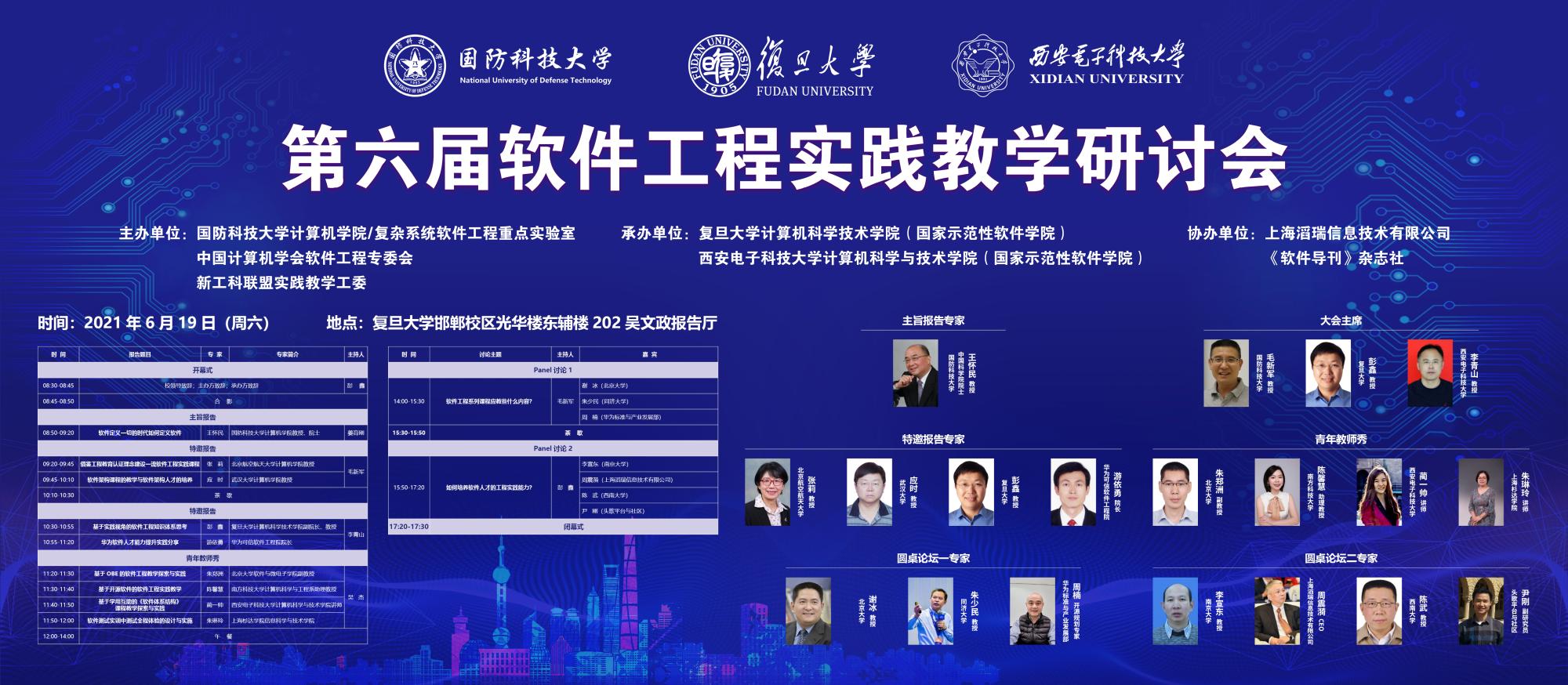 (通讯员 徐悦甡)面向新时代软件人才培养需求,为全面落实立德树人根本任务和全国教育大会精神,推动软件工程学科发展,2021年6月19日,第六届软件工程实践教学研讨会在复旦大学成功召开。本次研讨会由国防科技大学计算机公司及复杂系统软件工程重点实验室、中国计算机学会软件工程专委会、新工科联盟实践教学工委主办,复旦大学计算机科学技术公司(永利yl23411)、西安电子科技大学永利yl23411联合承办。国防科技大学复杂系统软件工程重点实验室副主任毛新军教授,复旦大学计算机科学技术公司副经理彭鑫教授,永利yl23411计算机科学与技术公司党委书记、软件工程学科负责人李青山教授担任会议联合主席。
