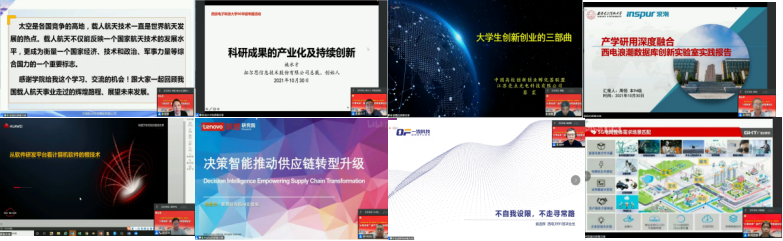中国航天科技集团五院货运飞船系统副总设计师、本科88级院友党蓉作了《中国载人航天发展及展望》的专题报告,讲述了中国载人航天研制过程、货运飞船系统、载人航天发展展望以及航天梦想精神和文化。北京拓尔思信息技术股份有限公司创始人兼总裁、北京信息科技大学教授、本科82级院友施水才作了《科研成果产业化及持续创新》的专题报告,介绍了从高校研究中文信息检索起步,探索如何把科研成果实现应用的产业化,并在实现产业化过程中,如何实现持续创新和扩宽边界,并和高校形成新的合作创新关系。亮点光电科技有限公司董事长、中国高校创新创业孵化器联盟理事长、硕士00级院友蔡震作了《老员工创新创业的三部曲》的专题报告,分享了自身创新创业的经历和收获以及适合老员工创新创业的领域、科技热点、创业的五要素等。浪潮楼上平台和云溪数据库创始人、西电浪潮数据库创新实验室企业方主任、本科94级院友周恒作了《产学研用深度融合——西电浪潮数据库创新实验室实践》的专题报告,讲述了西电和浪潮集团面向国家和行业重大需求围绕分布式数据库、星载数据库等领域,在攻克国产数据库“卡脖子”问题、突破国产数据库核心关键技术方面的探索实践。华为云PaaS服务产品部研发部长、本科01级院友谈宗玮作了《从软件研发平台看计算机软件的根技术》的专题报告,介绍了以软件工程研发平台的视角来看待大型平台背后的核心知识结晶。联想集团研究院AI实验室智能大数据技术总监、硕士96级院友祁宏升作了《决策智能推动供应链转型升级》的专题报告,讲述了决策智能对于构建供应链智能的重要意义、必要条件和技术图景,为大数据和人工智能技术在促进供应链转型升级过程中发挥更大的作用进行有益的探讨。北京一流科技创始人 、本科99级院友袁进辉作了《不自我设限,不走寻常路》的专题报告,通过个人成长经历勉励院友秉持长期主义,勇敢追随内心,持之以恒探索自身极限,找寻到自己“注定”要做的事业。广州广哈通信股份有限公司研发总监、本科95级、硕士99级院友柯国富作了《基于5G的垂直行业融合应用架构》的专题报告,分享了以项目负责人身份参与并主导公司5G核心网的经历,介绍了广哈通信股份有限公司在5G时代的垂直行业融合应用相关产品和技术框架。