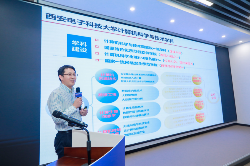随后,沈玉龙教授与参会企业共同分享了《计算机技术前沿发展趋势》主题报告,并进行了开放应用场景的“揭榜挂帅”,从计算机科学与技术和软件工程两大学科,详细讲解了西电永利yl23411科学研究内容和技术应用场景。