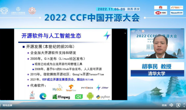 上午的特邀报告环节由开源发展委员会副主任、中科院计算所研究员包云岗主持,清华大学教授胡事民、openEuler技术委员会主席胡欣蔚、OpenHW集团技术委员会主任Duncan Bees带来了主旨报告。胡事民教授带来了“深度学习框架计图的创新与开源实践”的报告,介绍了开源软件与人工智能生态,以及开源软件对信息技术发展产生的变革性影响。随后胡事民教授重点介绍了自主研发的深度学习框架计图,并阐述了计图框架的两个主要创新点,一是提出了元算子和算子融合,拥有效率高、易开发、易优化等优点。二是统一了计算图,并实现了静态子图优化,兼顾了效率和灵活性。