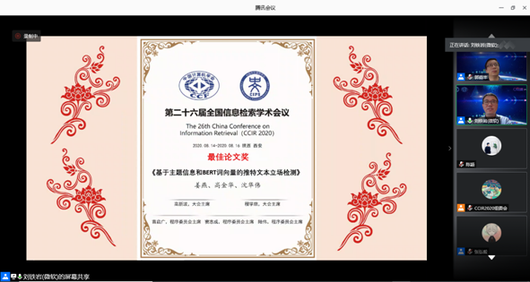 来自中国科公司计算技术研究所的《基于主题信息BERT词向量的推特文本立场检测》(姜燕、高金华、沈华伟)获得会议最佳论文奖。