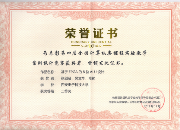 在论坛会议期间,张剑贤、吴文华、陈勉三位老师的实验教学案例《基于FPGA的8位ALU设计》获第四届全国计算机类课程实验教学案例设计竞赛二等奖;张剑贤、吴文华、刘锦辉、裘雪红几位老师的教改论文《基于FPGA的8位SoC微体系结构设计》获会议优秀论文二等奖,并推荐至《计算机教育》中文核心期刊发表。
