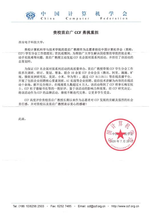 (通讯员 李栋)为打赢疫情下的求职攻坚战,更好地为毕业生提供高质量的就业指导服务,帮助同学们提前了解企业、开阔视野,同时切实解决广老员工因疫情而导致的就业难、实习难等问题,中国计算机学会(CCF)理事、西安分部主席、永利yl23411副经理苗启广教授志愿担任总策划师,主动发起CCF名企面对面系列活动。由此,中国计算机学会(CCF)特发来感谢信,向公司及苗启广教授表示诚挚感谢。